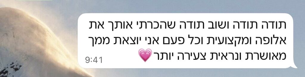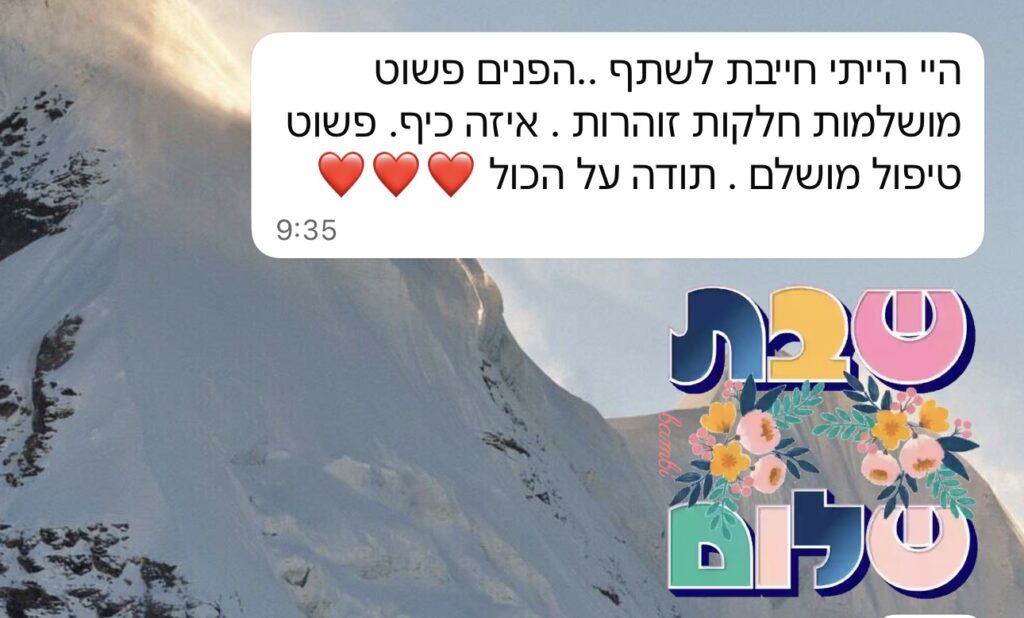 אני לא נפרדת ממך בסוף הטיפול. אני מלווה אותך בהתאמת שגרת הטיפוח הביתית וזמינה לכל שאלה בוואטסאפ.